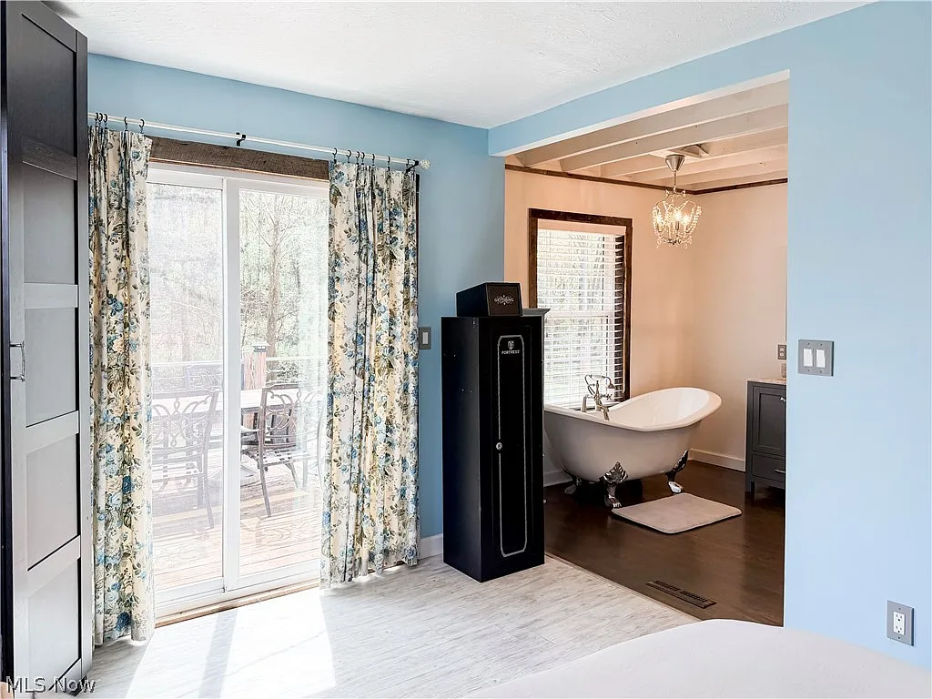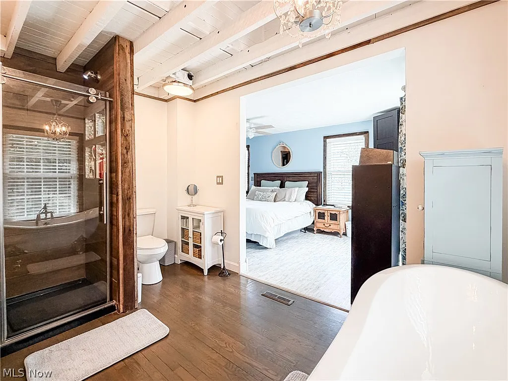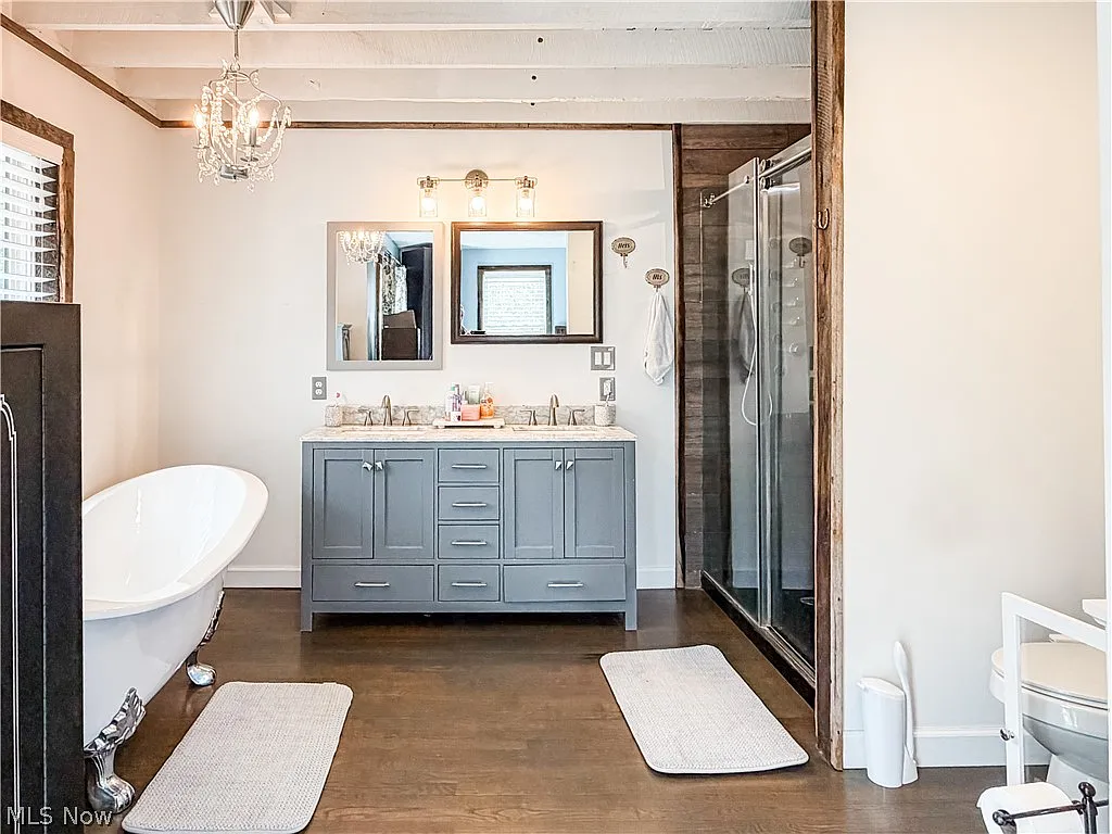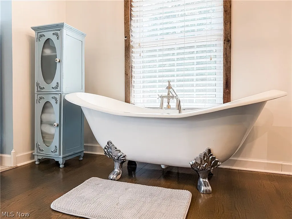 The primary suite offers a spa-like bathroom with a clawfoot soaking tub, tiled walk-in shower, and generous closet space. A loft area provides flexible living or guest space, with hardwood floors and warm finishes throughout.