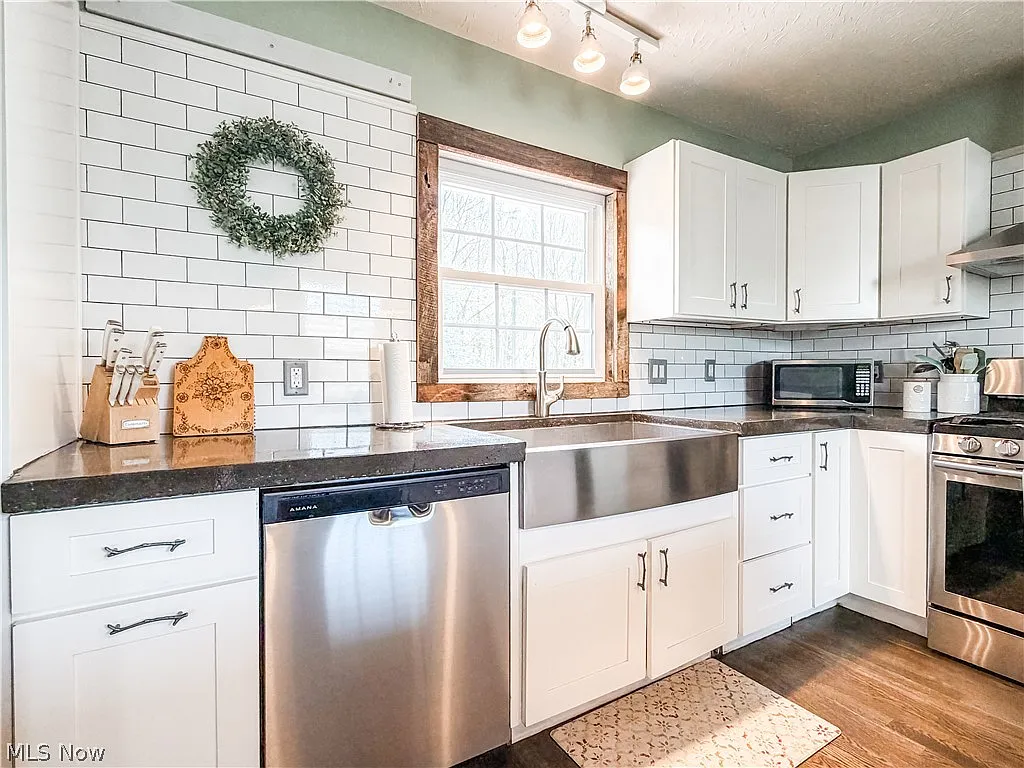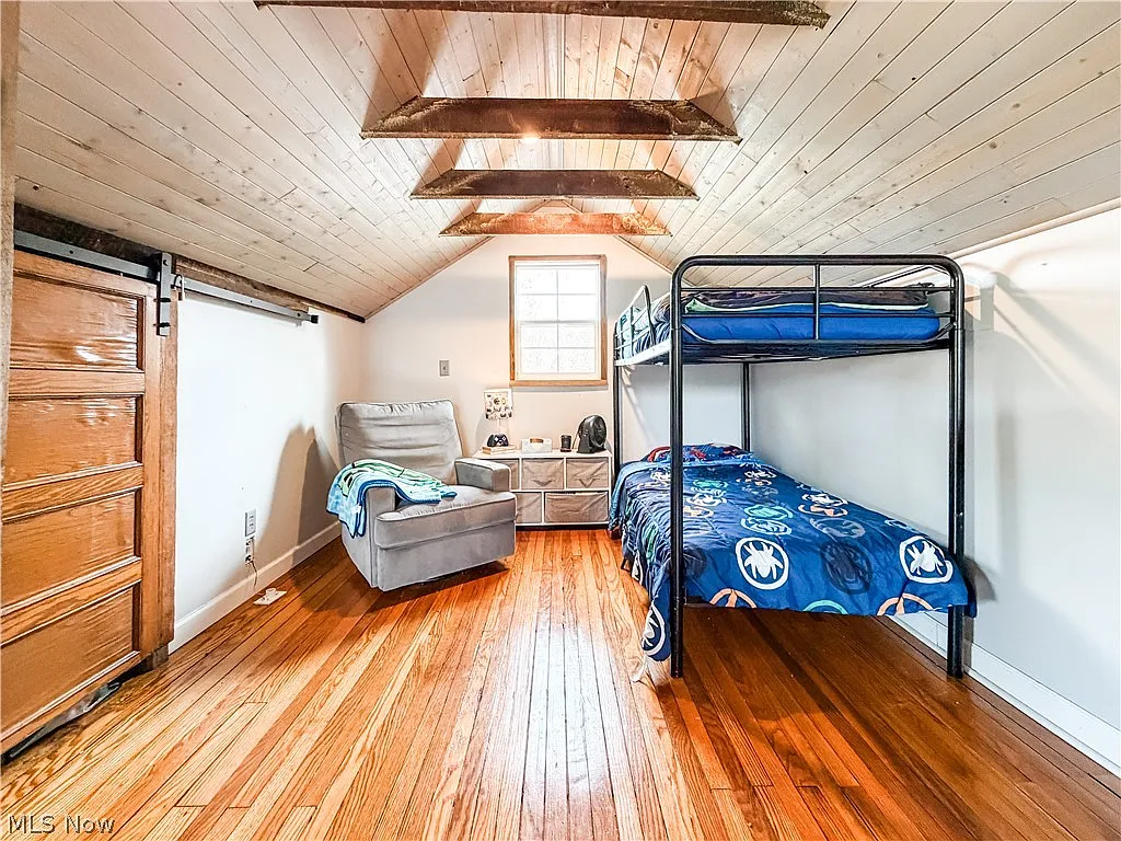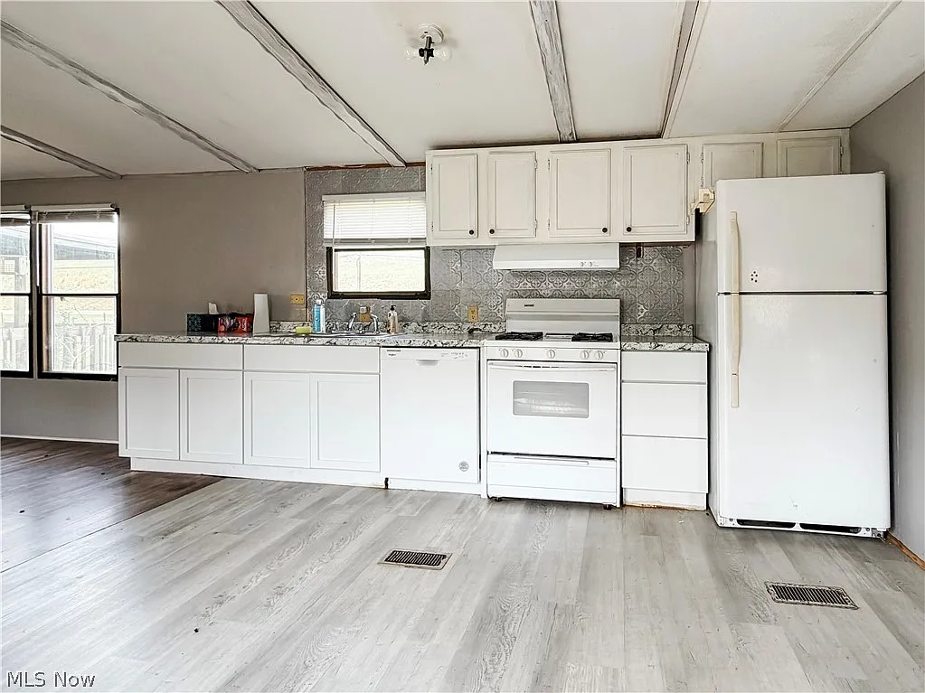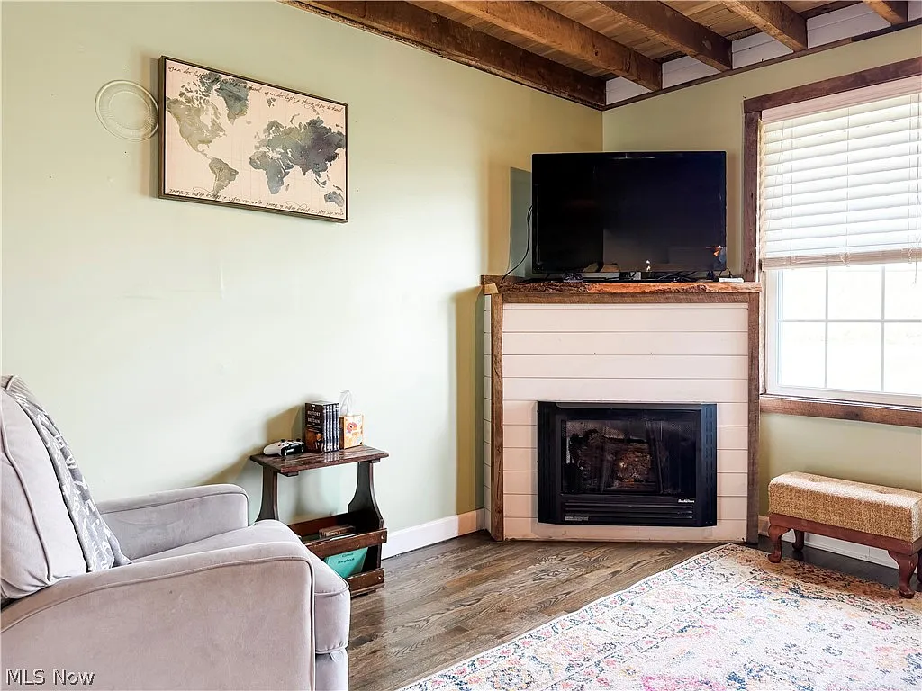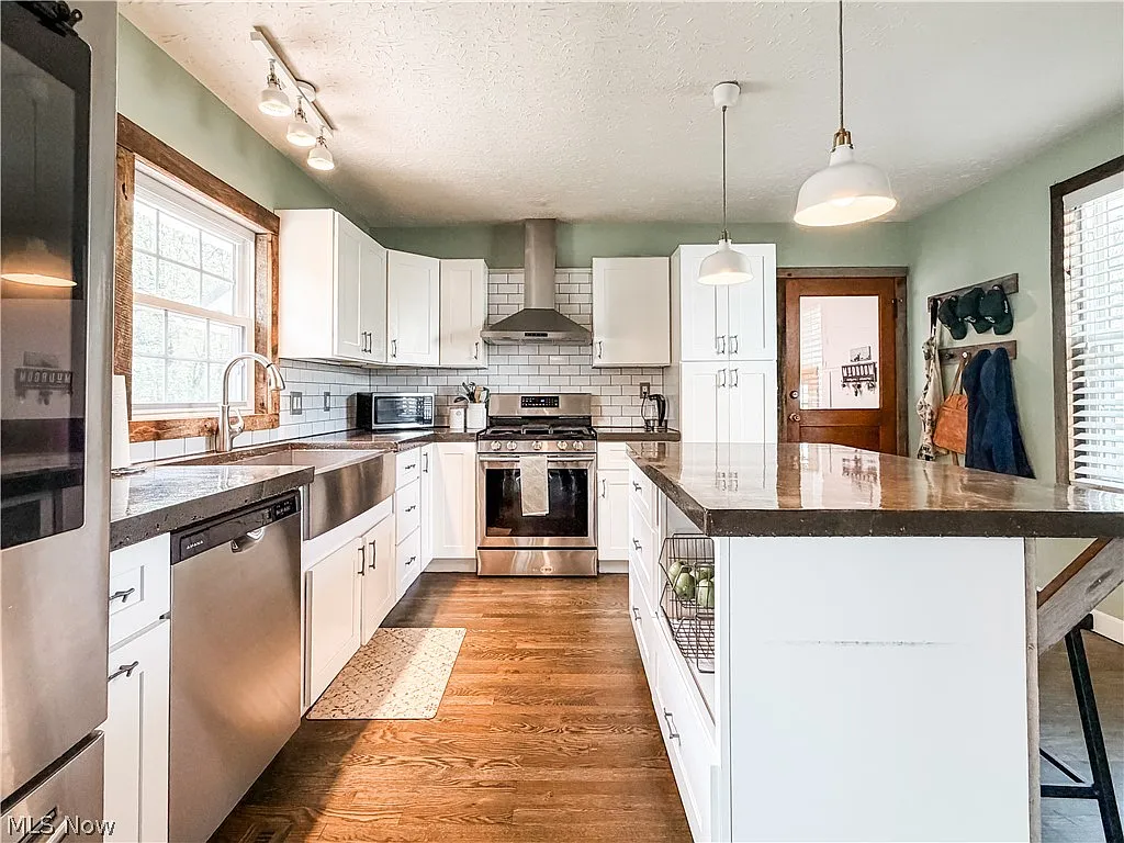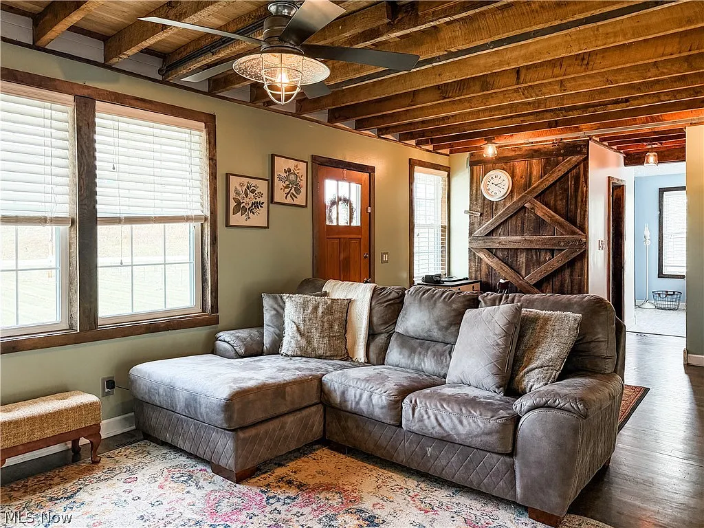 This charming home features an open-concept layout with exposed wood beams, rustic finishes, and abundant natural light. The updated kitchen includes a farmhouse sink, stainless steel appliances, subway tile backsplash, and large island with seating—perfect for entertaining.